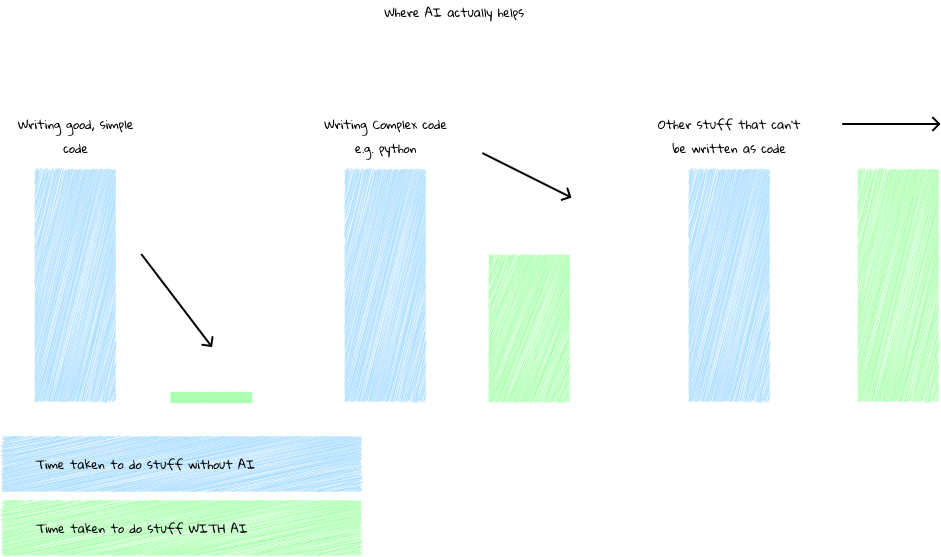 In the diagram above, you can see how writing code takes less time with AI.