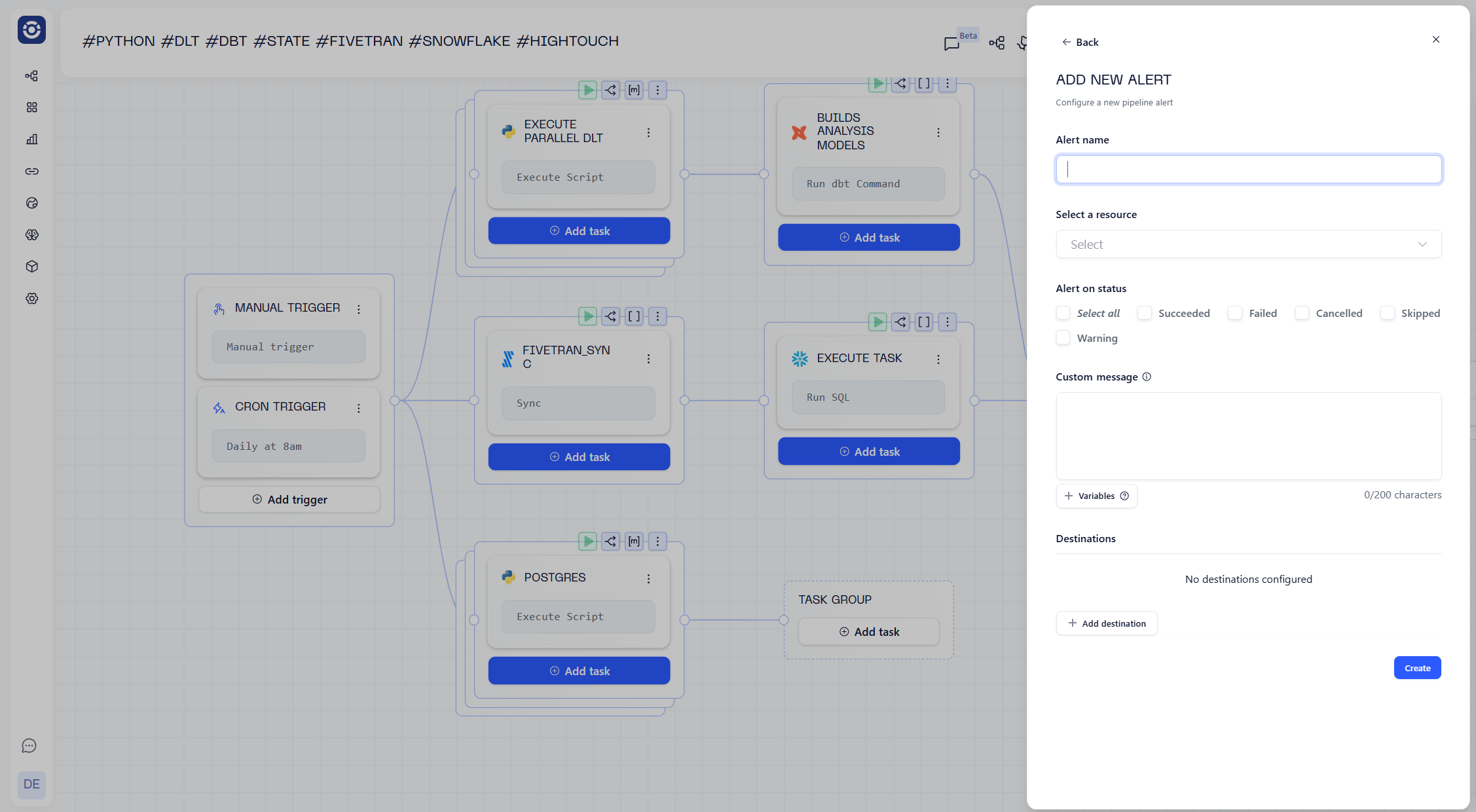 destination: alert-testingThis end-to-end pipeline is c.100 lines long. It handles triggering, monitoring, alerting, gathering metadata and data assets, error handling, lineage, and of course, orchestration.