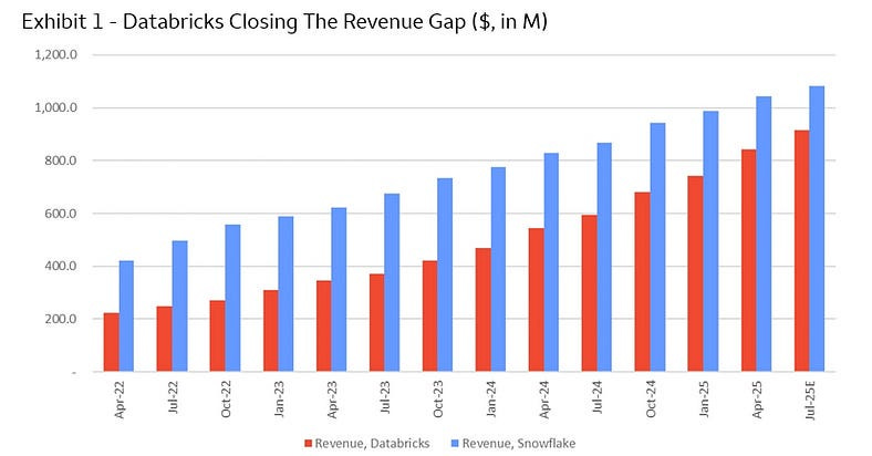 Handkerchief maths — the revenue is $4.8bn RR growing at 55%. Say we’re growing at 30% in steady state we’re missing 25%. 25% of $4.8 is $1.2bn. Where can this come from? Supposedly existing AI products and existing Warehousing is already over $2bn (see here). What happens next year when Databricks is at $6bn and we need to grow 50% and therefore need $3bn? Is the business going to double the AI part?